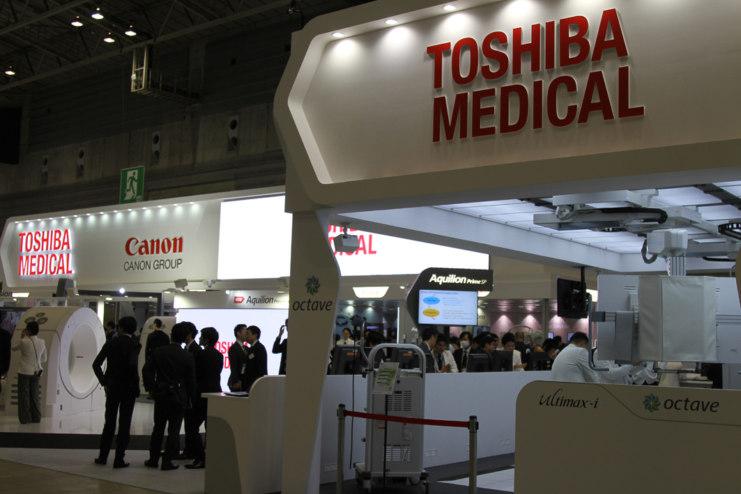 東芝メディカルシステムズブース白地の外壁には、『TOSHIBA MEDICAL』と並んで『Canon』の赤文字のロゴが目立つ。来年初頭を目処とした『キヤノンメディカルシステムズ』スタートを控え、ITEM2017での新製品展示への意気込みは例年にも増して強いものがあった。
