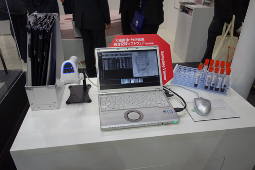 上記、血管撮影装置「Trinias C16 unity edition」のすぐ奥に展示されていたのが、「AVS支援システム」である。AVSとは「Adrenal Venous Sampling:副腎静脈サンプリング」の略。血管撮影システムによって得たX線画像と液体クロマトグラフ質量分析計システムによる分析結果を融合記録して、効率的かつ迅速な血液分析を実現する。分析技術で世界的にも評価の高い島津製作所であるが、社内の医用画像との融合は他社にはない価値を創造したといってよいだろう(東北大との共同開発)。なお、本システムは、X線画像と分析結果を融合して記録するソフトウェア「Sampling Viewer」(写真上)、液体クロマトグラフ質量分析計「LCMS-8050」システム&制御用ワークステーション、LC-MS用ソフトウェア「AVSsolution」で構成される(写真下)。