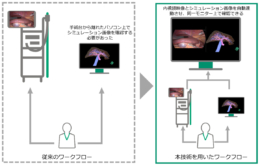 また、近年では、患者への負担が少ない、腹部に小さな穴をあけて行う「腹腔鏡下手術」やロボットを使った「ロボット支援下手術」の手術件数が増えている。そうした手術では、肝臓の表面からは見えない血管や腫瘍の位置を確認するために、術中超音波検査が行われているが、医師は手術中に観察する内視鏡映像と、超音波画像を同時にそれぞれ別の画面で見る必要があった。さらに、超音波画像に映った血管や腫瘍が、内視鏡映像のどこにあるかを頭の中でイメージしながらプローブを走査する必要があり、術者には高度な技術や豊富な経験が求められる。そのため、手術中に超音波プローブ走査や画像の確認をより簡便に行える技術が望まれていた。