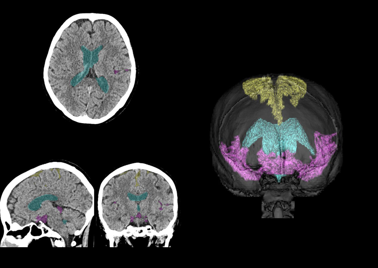 CT画像上で本技術を用いて脳脊髄液腔の各領域を抽出した例