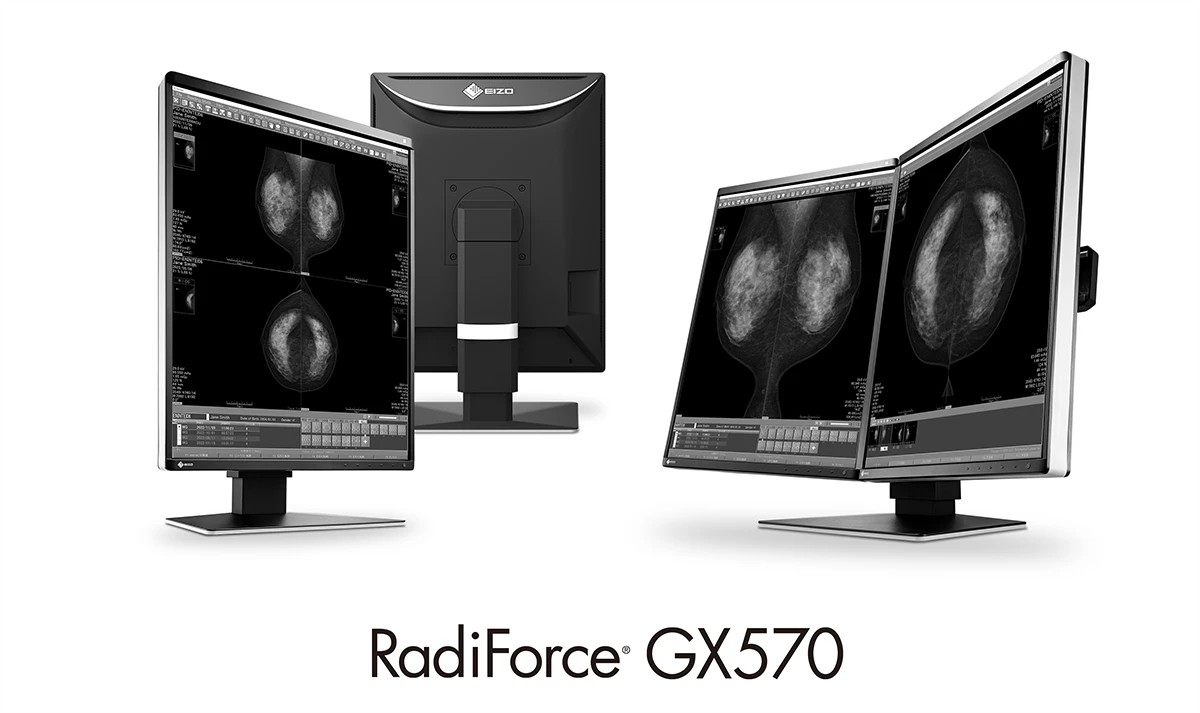 乳がんの早期発見には、初期症状である微細な石灰化を正確に見つけ出すことが重要である。マンモグラフィ(乳房X線)やブレストトモシンセシス(乳房3Dマンモグラフィ)の検査画像では、こうした石灰化はわずか数ピクセル程度の大きさしかなり。そのため、重要な画像情報を損なうことなく鮮明に表示するには、高解像度モニターが必要となる。このニーズに応えるため、当社は医用画像表示モニター「RadiForce」シリーズにおいて、医用画像を細部まで鮮明に表示できる5メガピクセル解像度のモノクロモニターを、23年間にわたり販売してきた。今回発売するGX570は、現行機種である5メガピクセルモノクロモニターGX560の後継モデルである。